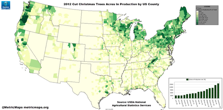 Em 2017, havia cerca de 15.000 fazendas de árvores de Natal nos EUA. A maioria tem cerca de 23 acres e quase metade gera menos de US$ 25.000 anuais. Um grande número de empreendimentos com árvores de Natal faz parte de operações agrícolas maiores, e muitos produtores têm empregos fora da fazenda.